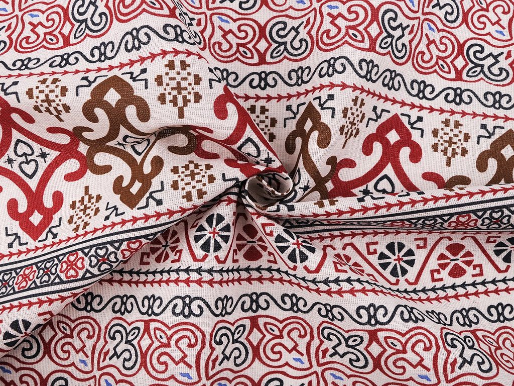 Látku imitující len zdobí orientální vzory. Využijete ji na šití ubrusů, běhounů, prostírání, dekoračních polštářů, tašek, dětských teepee apod.