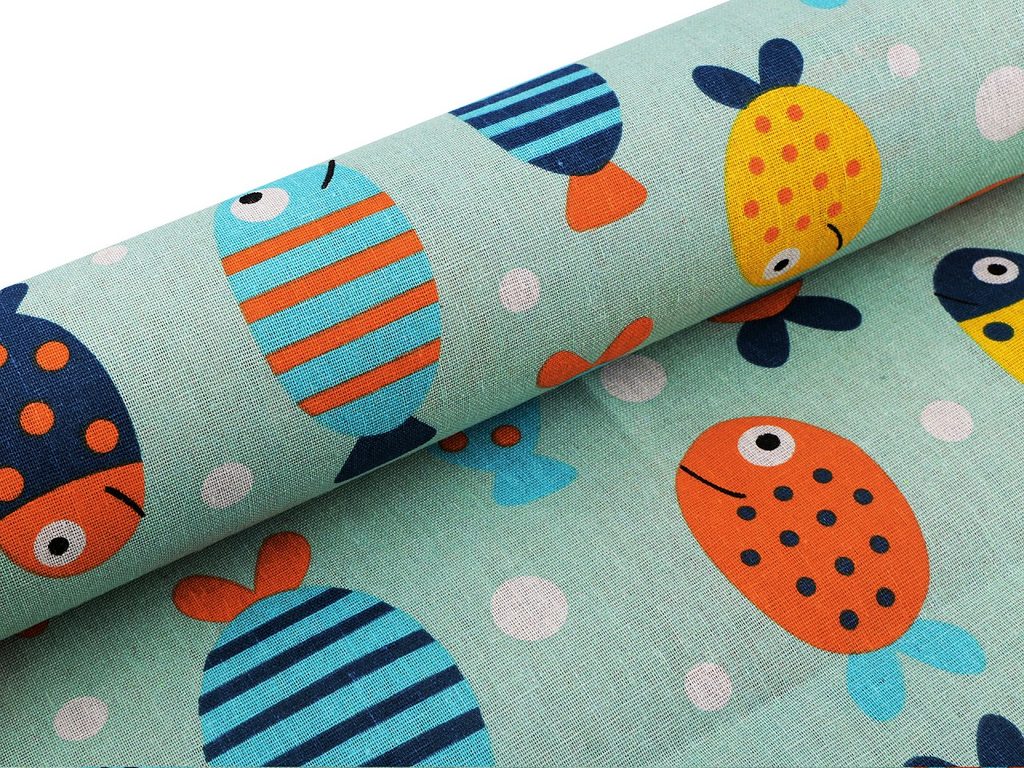 Látku imitující len zdobí motiv s rybičkami. Je vhodná na šití ubrusů, běhounů, prostírání, dekoračních polštářů, tašek, dětských teepee apod.