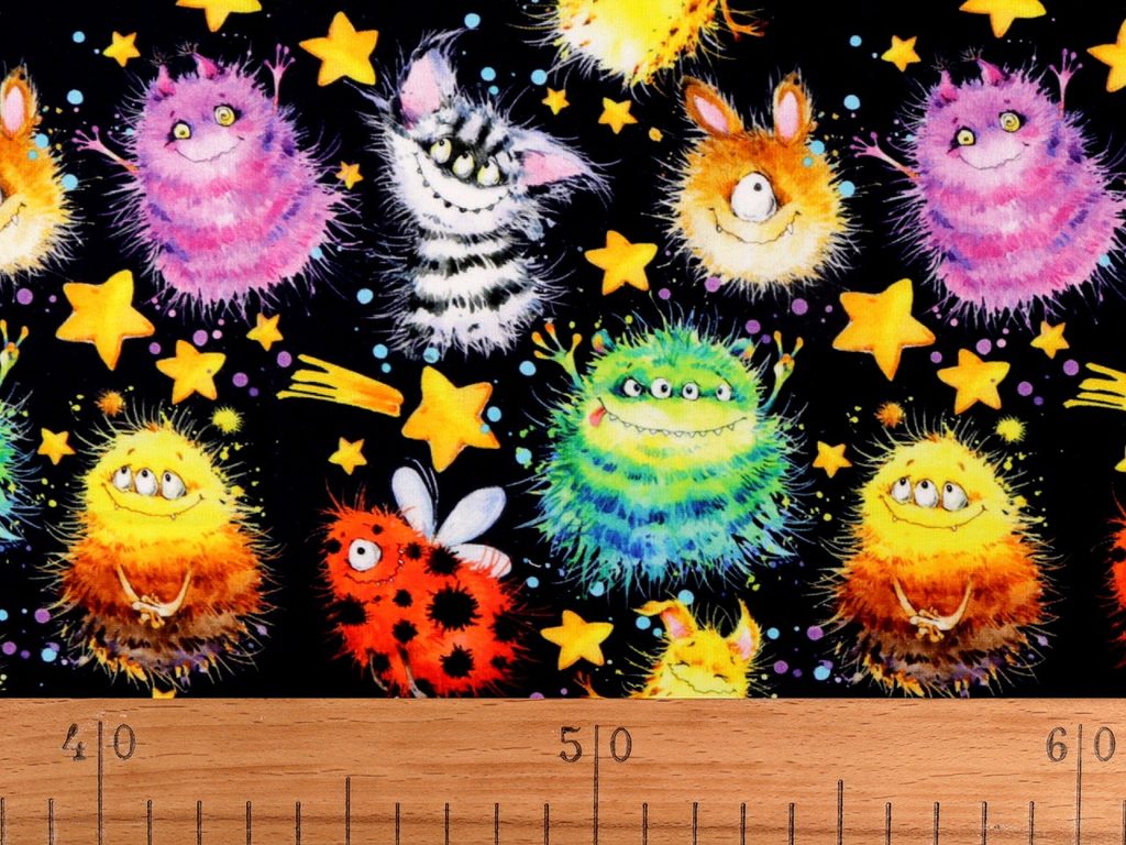 Nepočesanou teplákovinu zdobí kvalitní a efektní digitální potisk pestře barevných strašidel, který okouzlí hlavně děti. Látka je pružná do šíře i do délky. Můžete z ní ušít pohodlné tepláky, mikiny, kraťasy, vesty apod. Teplákovinu nemusíte začisťovat, po ustřihnutí se na ní udělá efekt rolovaného okraje.