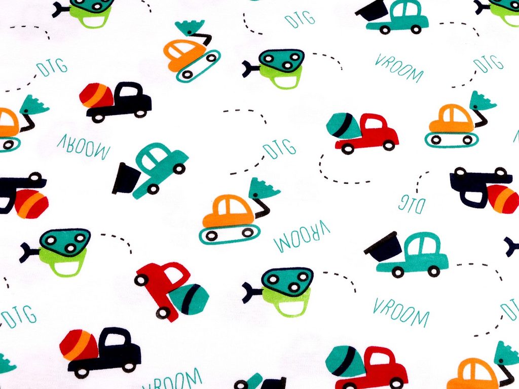 Úplet z bio bavlny s dětskými motivy je velmi příjemný na dotek. Pruží po šířce.