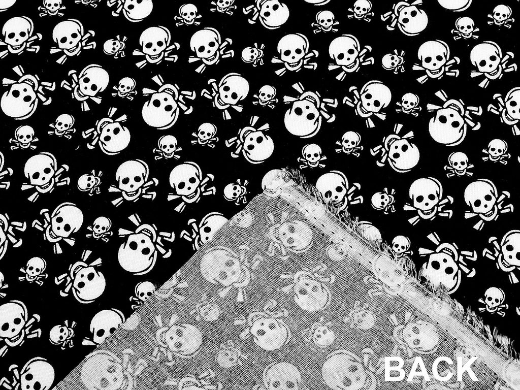 Bavlněné plátno zdobí potisk s lebkami. Můžete z něj ušít šátky (na hlavu, kolem krku), pytlíky, tašky a motorkářské či rockerské doplňky. Látka je vhodná i na halloweenské dekorace.
