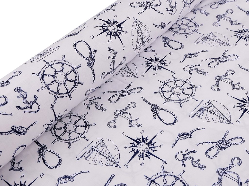 Bavlněná látka s námořnickým designem je vhodná na šití polštářů, povlečení, závěsů, tašek, ubrusů a jiných interiérových doplňků.