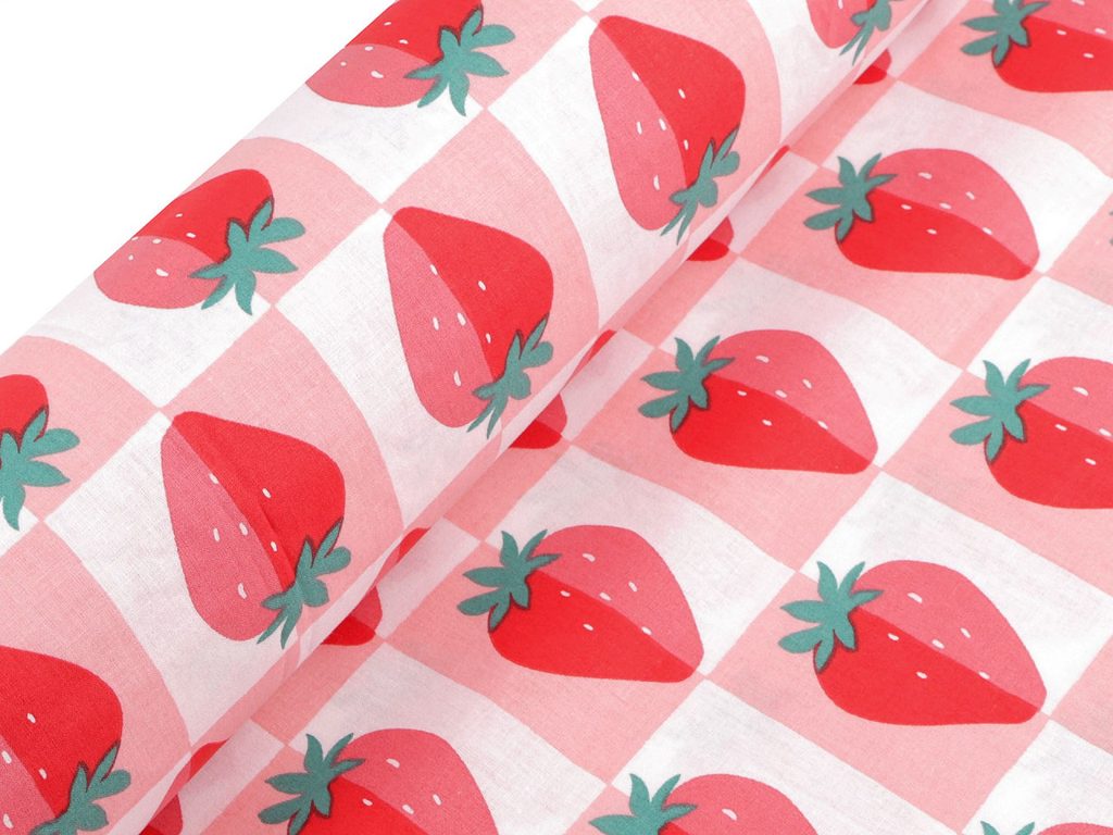 Bavlněnou látku s jahodami využijete k šití ubrusů, prostírání, tašek, pytlíků, zástěr nebo závěsů. Zajímavě vynikne na doplňcích na chalupě.