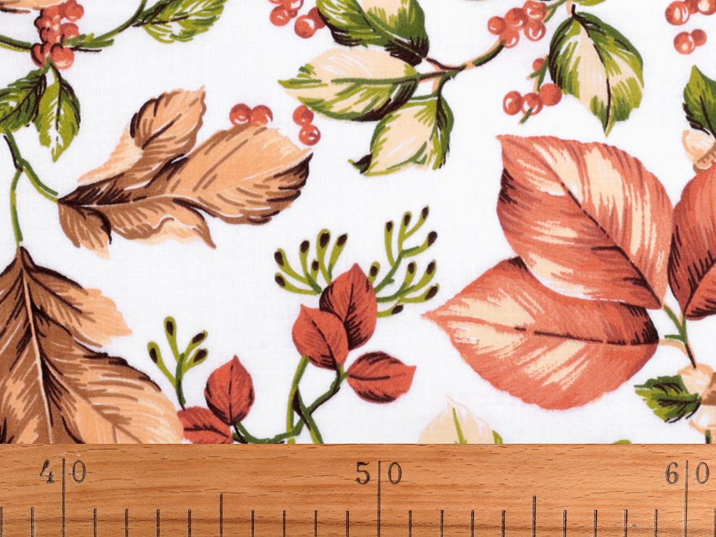 Bavlněnou látku s potiskem podzimních listů využijete na šití polštářů, povlečení, závěsů, ubrusů, tašek, pytlíků apod.