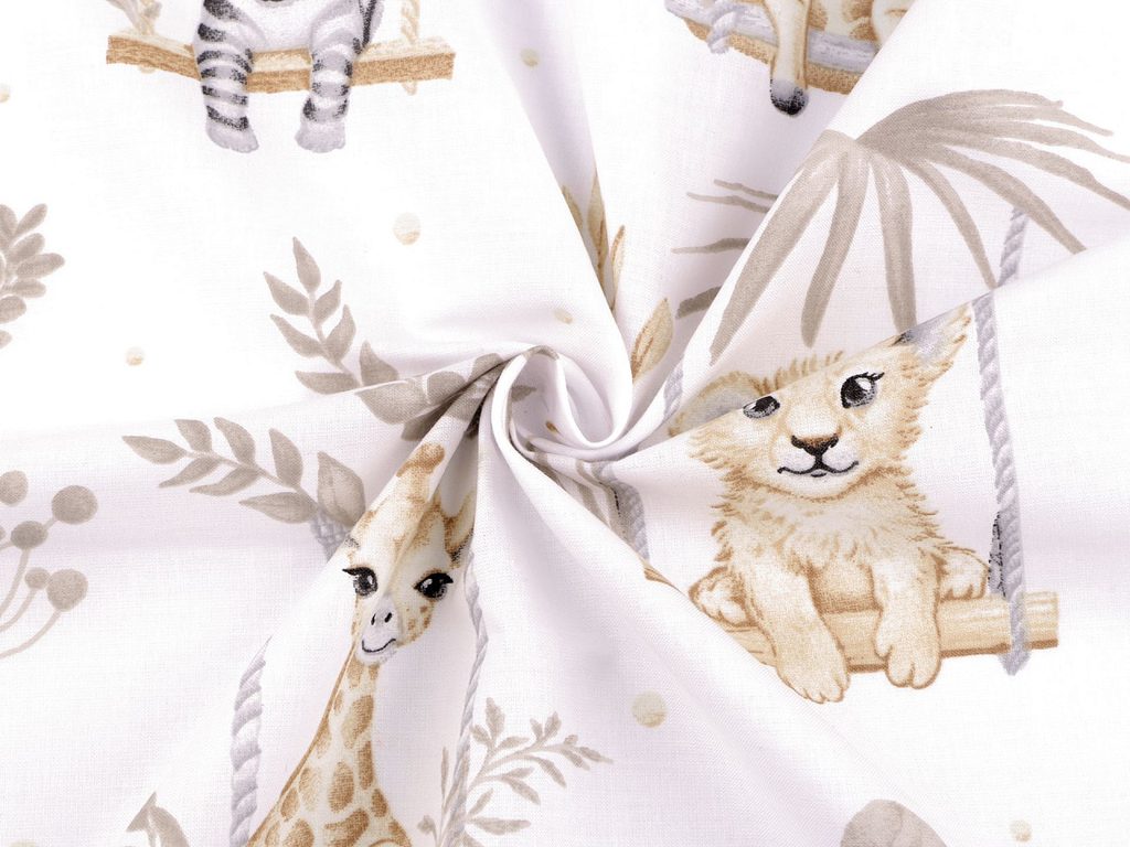 Bavlněné plátno zdobí potisk roztomilých zvířátek ze safari.