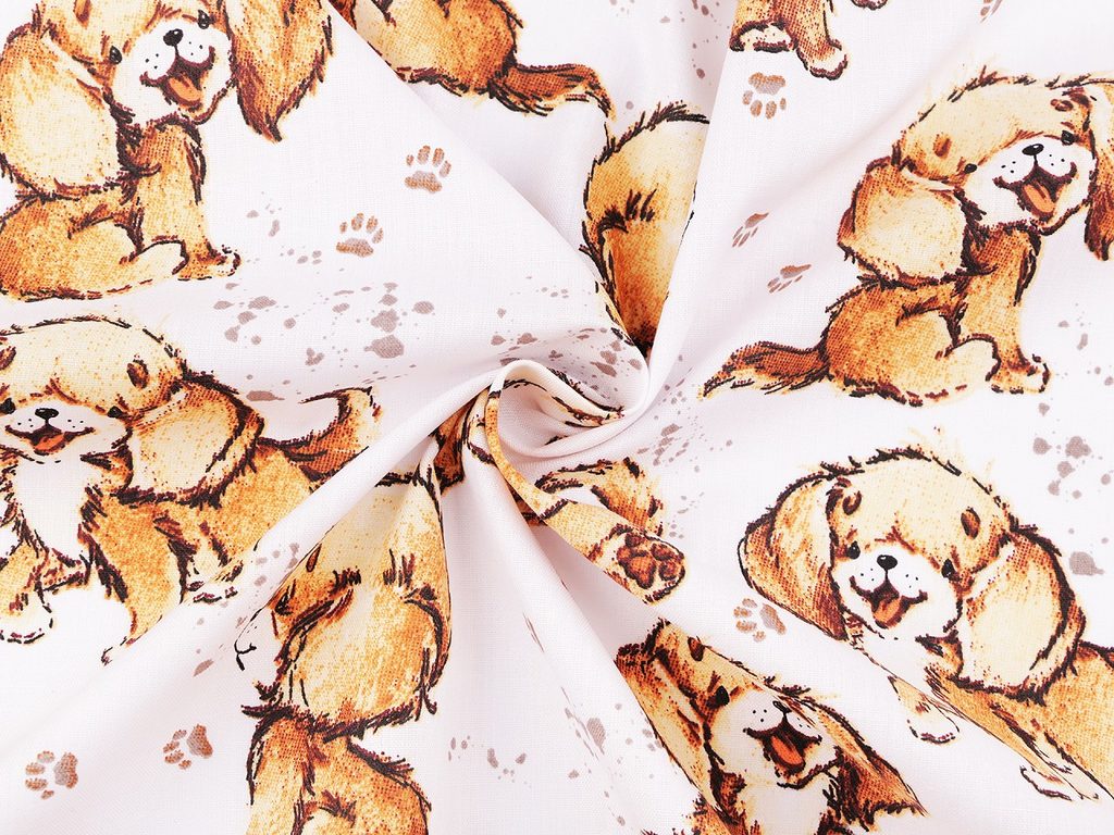Bavlněná látka s roztomilým pejskem se bude líbit dívkám i chlapcům. Je vhodná na šití polštářů, dětského povlečení, závěsů, pytlíků, tašek, mantinelů do postýlek apod.