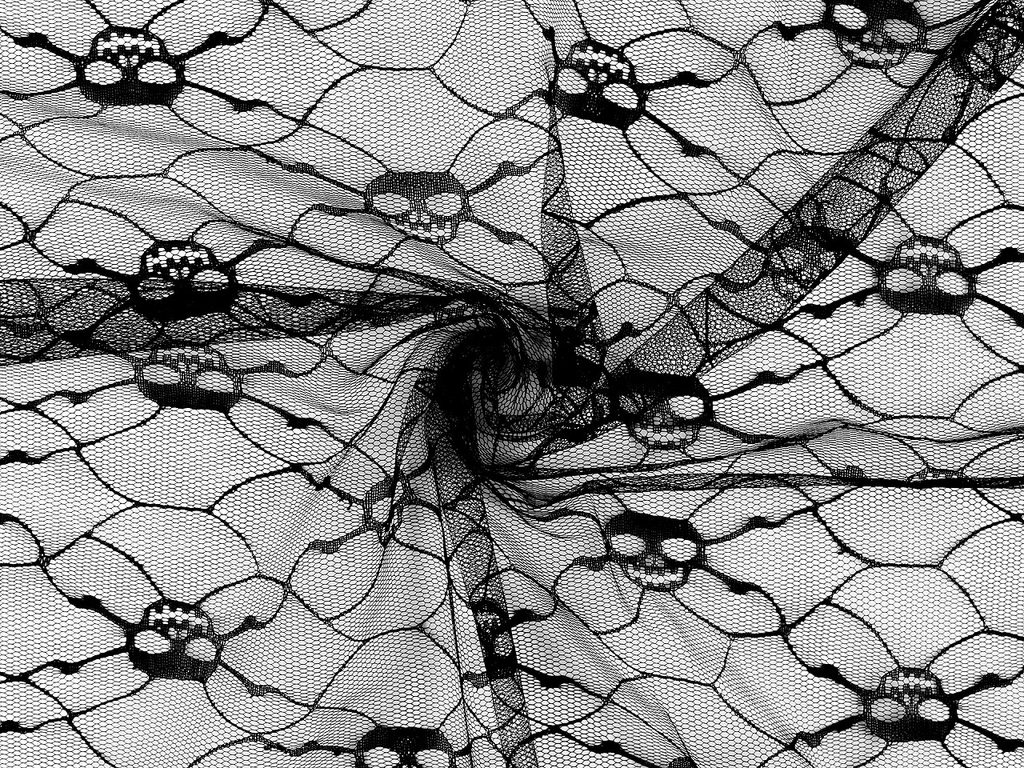 Jemný splývavý tyl se svým designem hodí na halloweenské kostýmy a strašidelné aranžování. Najdete na něm motivy lebek.