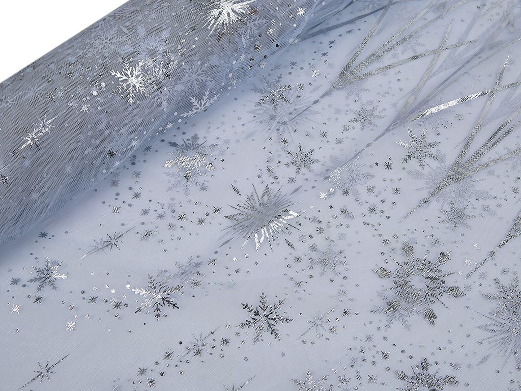 Tyl s potiskem vloček je jemný, měkký a pružný po šíři. Využijete ho na šití sukýnek, karnevalových kostýmů i různých dekorací a zimních aranžmá. Potisk vloček je lesklý a najdete ho po celé šíři na obou stranách.