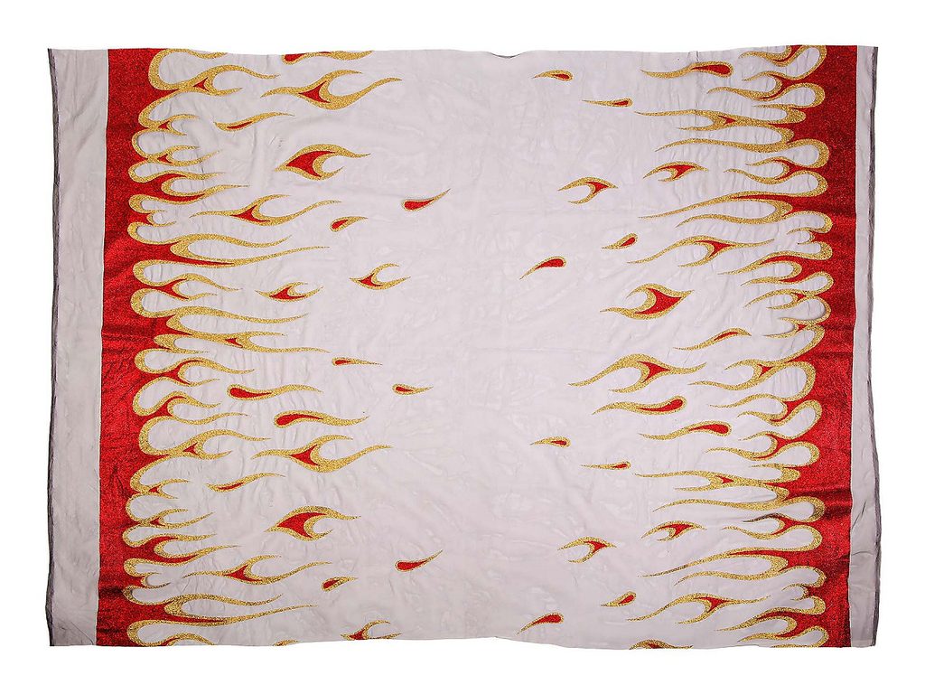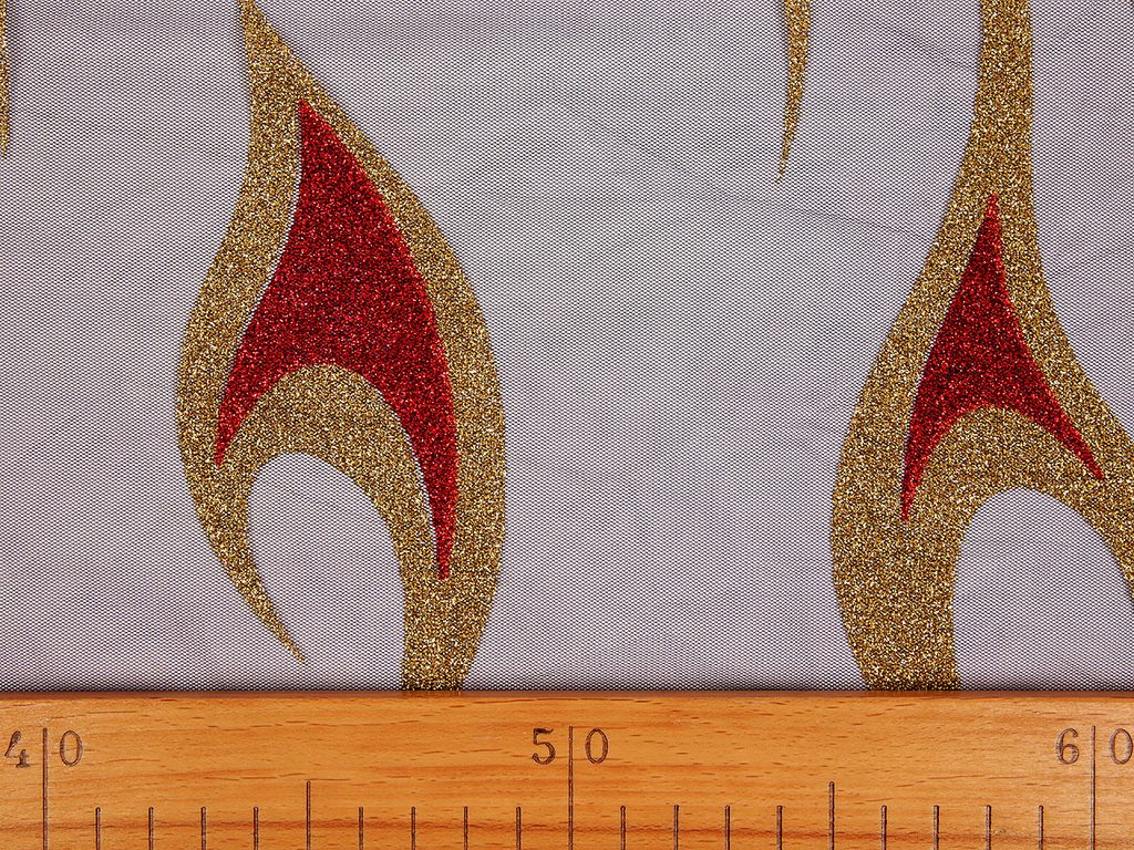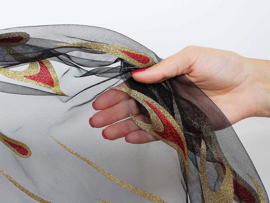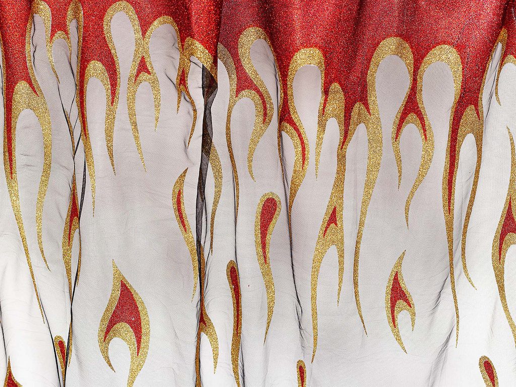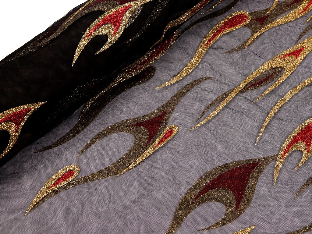 Oděvní tyl zaujme pozornost svým designem - po šíři na obou stranách je potisk glitrových plamenů, které se působivě třpytí. Tyl je jemný, ale v místě potisku je tužší.