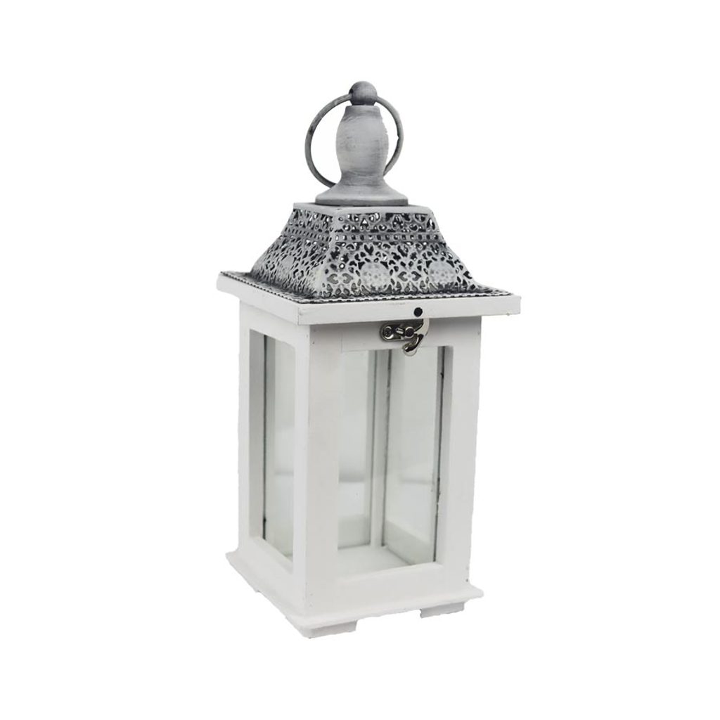 Dřevěná lucerna. Rozměry : 12,5 x 12,5 cm, výška 29 cm. Barva : kombinace bílá, šedá. Materiál : dřevo, sklo, kov. Vneste do svého domova či zahrady kouzlo orientální stylu. Tato lucerna je vyrobena ze dřeva a skleněných panelů, horní část je z kovu. Lucerna má praktickou rukojeť, která vám usnadní její přenášení mezi domem a zahradou.