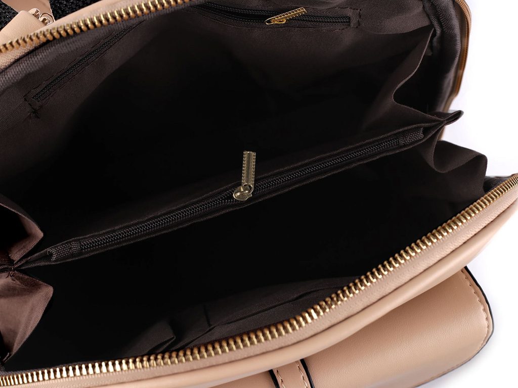 Hlavní kapsa je na zip, je velice prostorná. Je rozdělená přepážkou na dva oddíly, v přepážce je umístěná kapsa na zip. Nechybí ani vnitřní kapsička na zip na drobnosti či mobil a kapsa na uložení plochých předmětů. Na přední straně batohu je kapsa, která se zapíná na klopu s magnetickým zapínáním. Přezka je pouze ozdobný díl. Na zadní straně batohu je umístěná malá plochá kapsa na zip. Ucho je pevné, krátké do ruky či na pověšení. Popruhy jsou dostatečně dlouhé s možností regulace pro pohodlné užívání během celého dne. Jsou podšité látkou. Nahoře jsou popruhy v kovových průvlecích, které slouží na protáhnutí popruhů na nošení křížem jako kabelka. Dno batohu je opatřené kovovými hřeby, které jej chrání před poškozením.