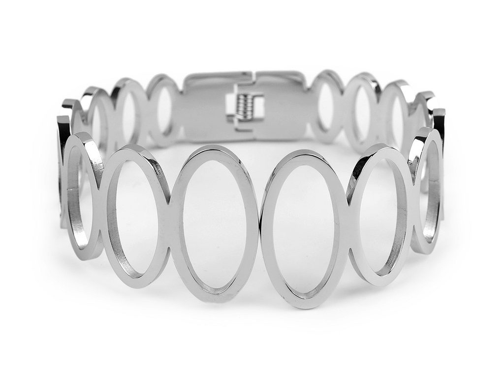 Rozevírací náramek s oválky je vyrobený z kvalitní nerezové oceli. Ocení jej ženy, které mají rády výrazné elegantní šperky. Má vysoký zrcadlový lesk, dá se nosit k jakémukoliv oděvu. Je ve tvaru oválu, vzadu má pružinu, díky které se může rozklápět. Směrem dopředu se náramek rozšiřuje. Rozevírací náramek dobře drží, samovolně nespadne.