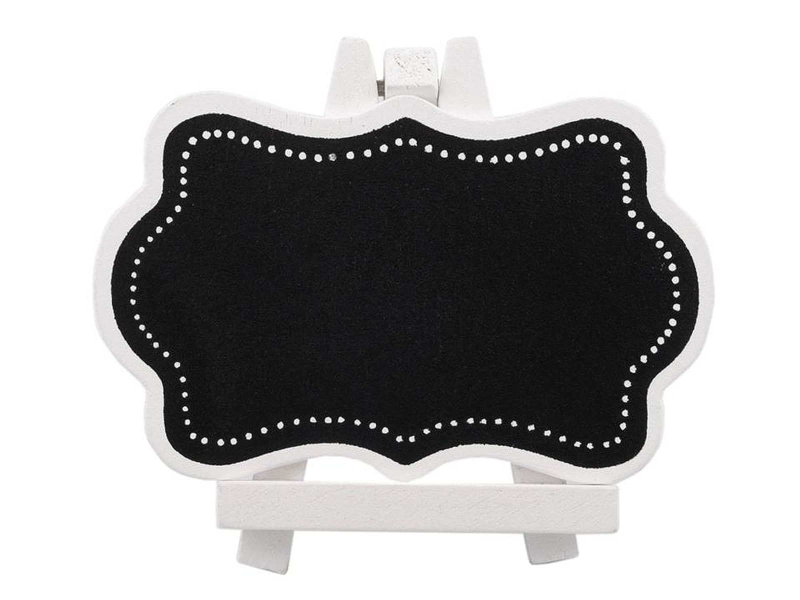 Dřevěná tabulka má nejen dekorativní, ale hlavně praktické využití. Je laděna do stylu vintage a zaujme vás její působivě vyřezaný okraj. Díky připevněnému stojánku v zadní části se přímo nabízí použití tabulky jako jmenovky, vizitky či cenovky. Upoutá také na svatbě u rautových stolů nebo candy baru. Na psaní můžete použít křídy, které v případě potřeby jednoduše smyjete vlhkým hadříkem. [Je natřená tabulovou barvou.]