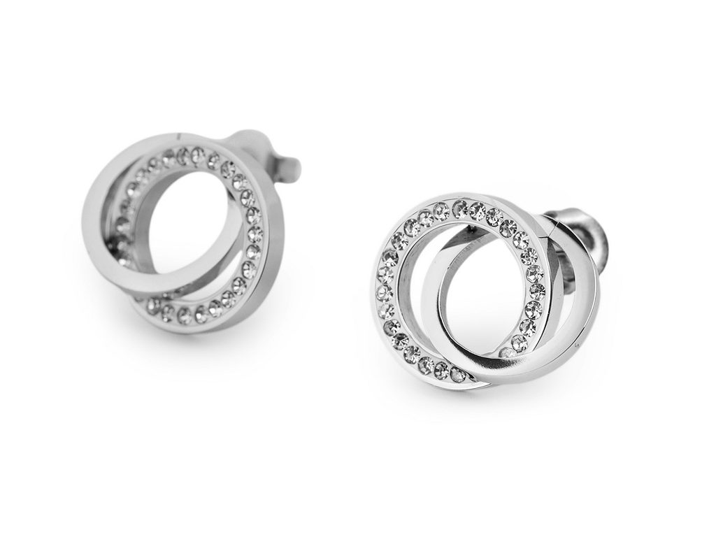 Náušnice propletené kroužky z kvalitní nerezové oceli skvěle doplní byznys styl oblékání, jeansovou módu, ležérní outfity i slavnostní šaty. Jeden kroužek z náušnice je ozdobený třpytivými broušenými kamínky. Povrch náušnic má vysoký zrcadlový lesk.