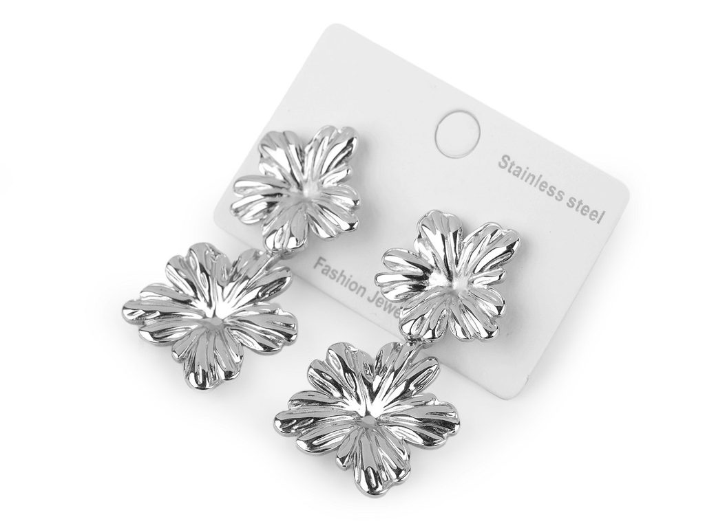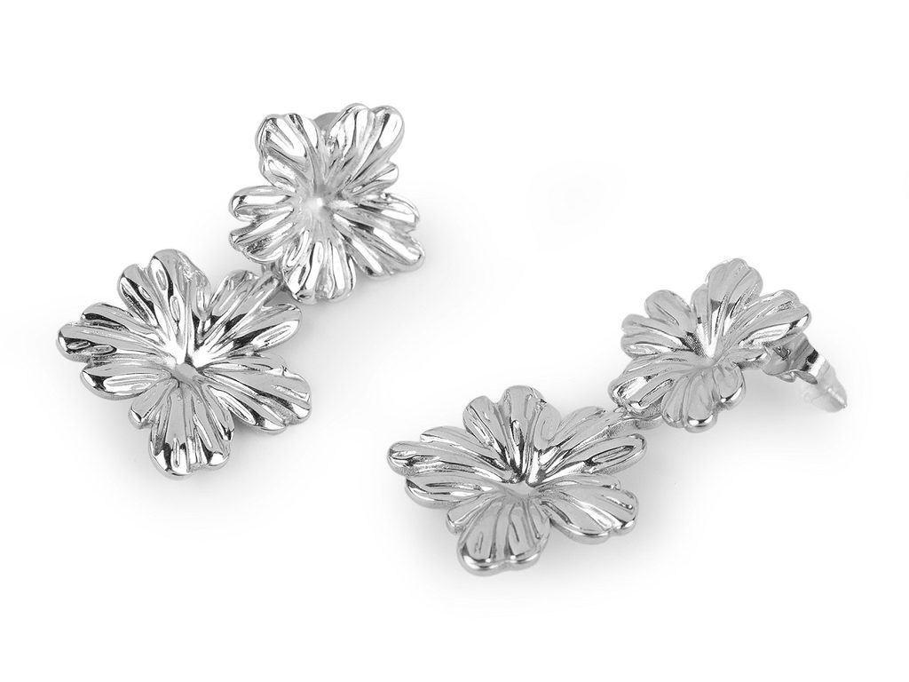 Náušnice se zavěšenými květy představují elegantní doplněk, který zaujme svým jedinečným designem. Jsou vyrobené z kvalitní nerezové oceli. Horní květ je pevný, dolní je zavěšený, při pohybu hlavou se pohupuje. Náušnice využijete na každodenní nošení i ke slavnostním událostem, působí romanticky.