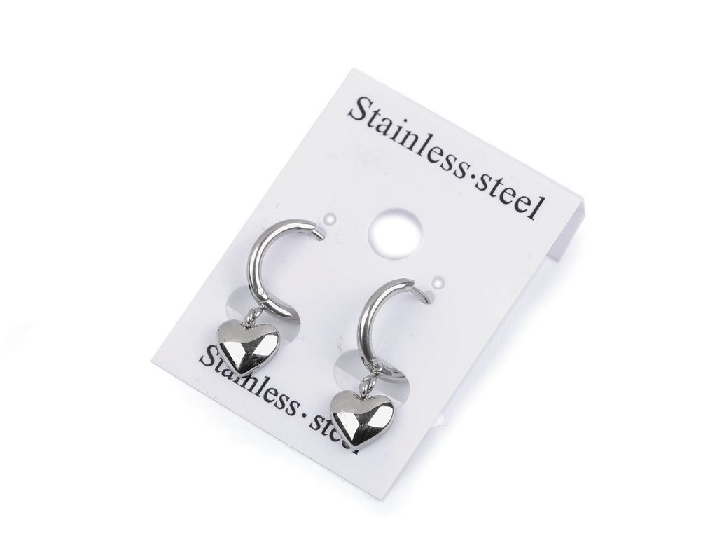 Kvalitní náušnice kroužky z nerezové oceli jsou velice elegantní a decentní. Dole jsou ozdobené přívěskem srdíčka. Oceníte je ke každodennímu nošení, ale hodí se i ke slavnostním příležitostem. Skvěle doplní byznys styl oblékání, jeansovou módu, ležérní outfity i společenské šaty.