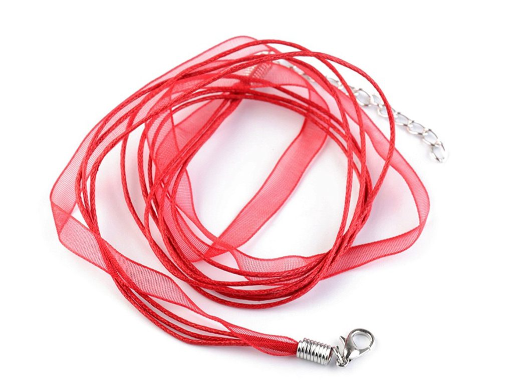 Hotový závěs z organzové stužky a tří voskovaných šňůrek je velice oblíbený. Stačí na něj zavěsit koupený nebo vlastnoručně zhotovený přívěsek. Zapíná se na klasickou karabinku a prodlužovací řetízek.