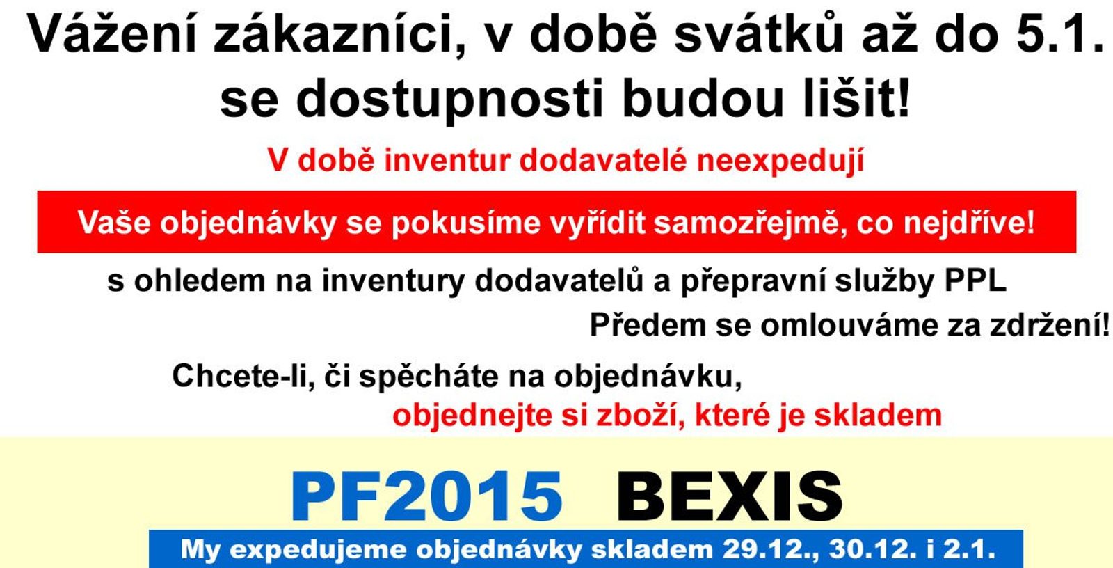 Akce platí vždy pouze tento den, kdy novinka byla vydána 27.12.2014 , nebo pokud je uvedeno jinak v novince. Max vždy jen týden - Marketingové akce jsou v eshopu Bexis plánovány týdně.