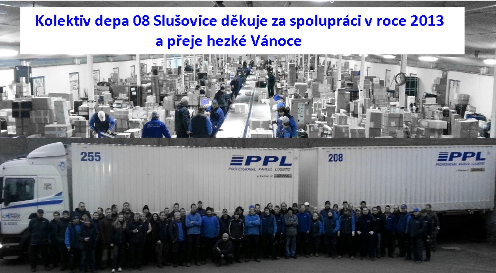 Pracovníci PPL nám zaslali hezké foto z jejich depa PPL Slušovice. Přejeme všem PF2014, jelikož se pf přání o Vánocích množí, rozhodli jsme se, že nebudeme letos emailem rozesílat tyto přání z důvodu množství emailů, které jsme rozesílali před Vánoci. Lidem z PPL mnoho úspěchů při doručení toho 23.12.