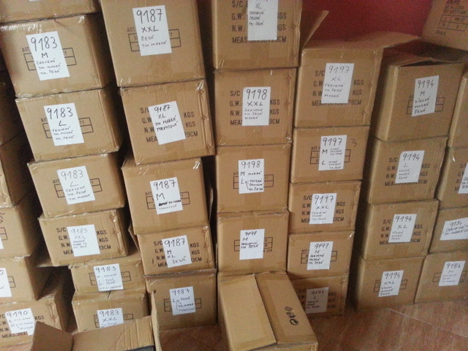 Všechny tyhle krabice + další krabice v další řadě obsahují pánské pyžama Andrie. Sklad na vánoční sezónu máme v pyžamách dobře zásobený. Prodeje pánských pyžam napovídají, že sezóna v sortimentu pyžam na plno ještě dnes nezačala.