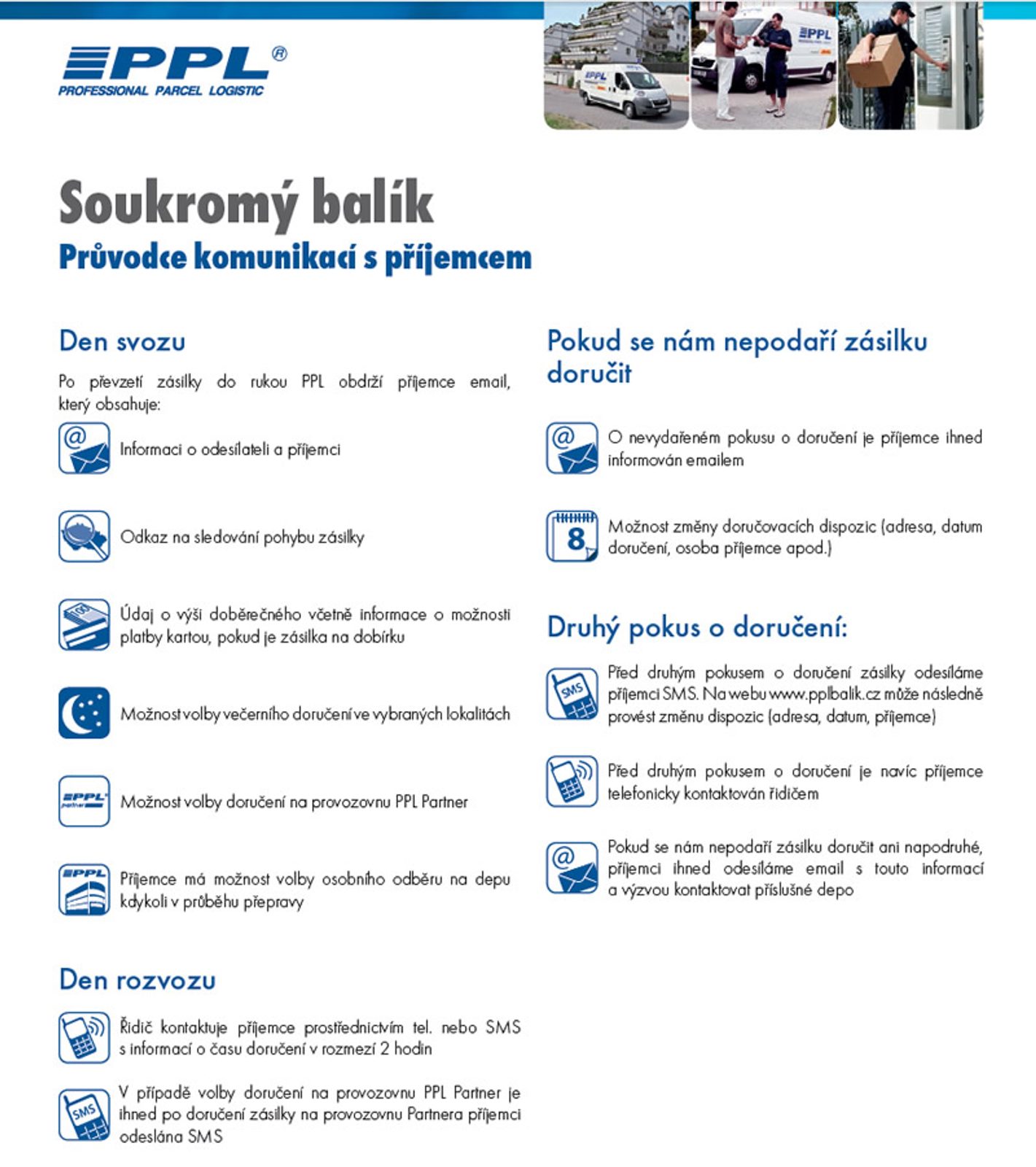 Jelikož využíváme k přepravě Vašich objednávek rovněž soukromé balíky PPL. Tak získáte ještě větší přehled o objednávce a balíčku, kde zrovna je a kdy bude doručen. Všechny příjemce Soukromých balíků bude PPL informovat v den doručení SMSkou, ve které uvedeme dvouhodinové okno doručení. Emailová komunikace zůstává i nadále beze změny.