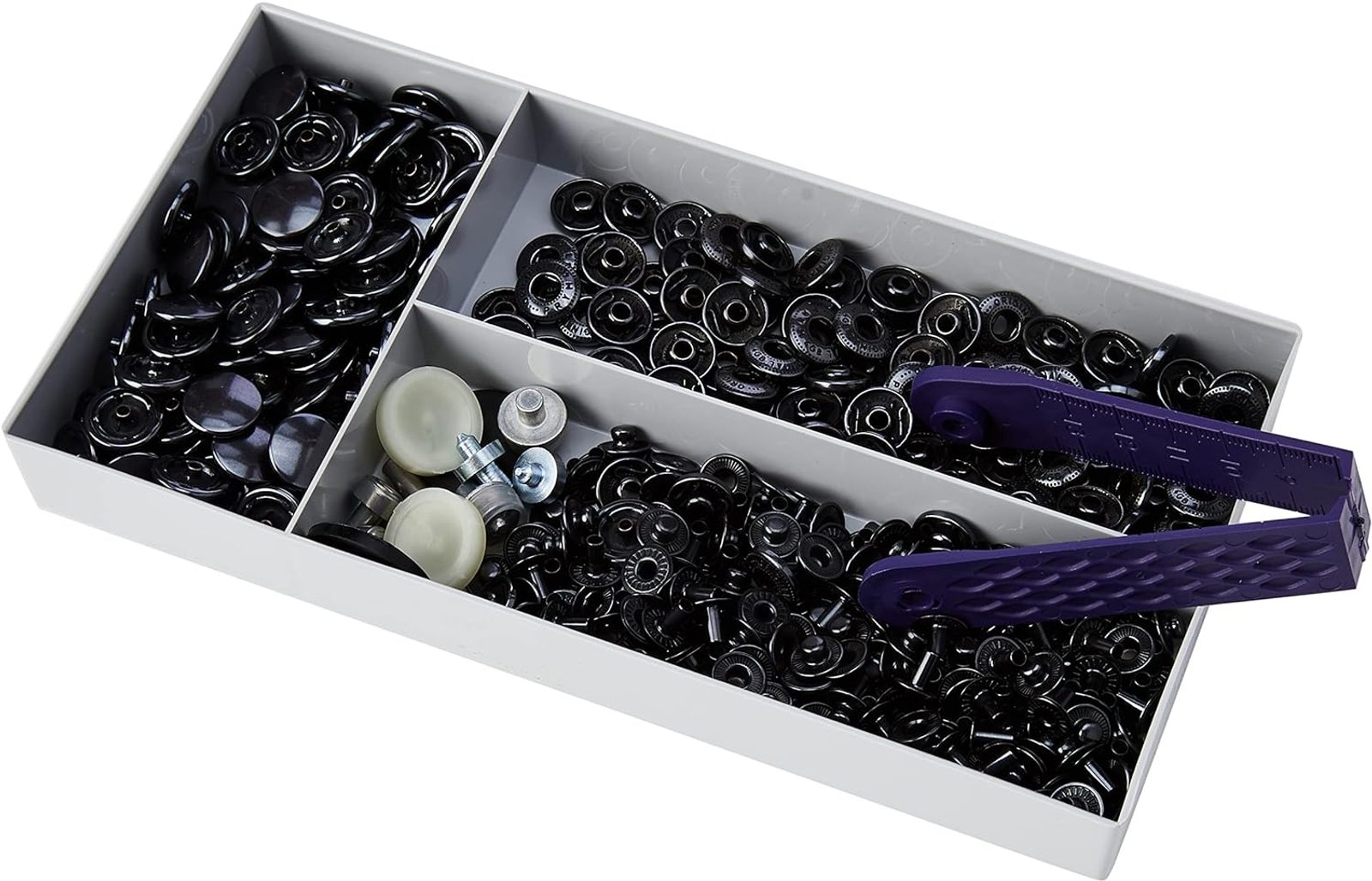 Stiskací knoflíky ANORAK 15 mm, 100 ks v balení, černý nikl, s návodem a příslušenstvím.