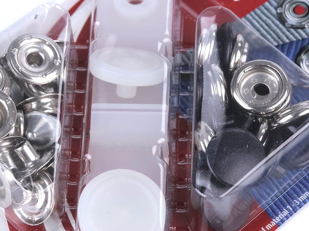 Stiskací knoflíky se používají ke spojování běžných druhů látek. Nýtování se provádí plastovým mini lisem, který je součástí balení. Knoflíky jsou nerezavějící. Návod na nýtování viz obrázek.
