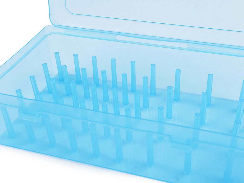 Box s pákovým uzavíráním využijete na uskladnění 42 ks špulek s nitěmi. Díky kolíkům, které jsou na dně boxu, zůstanou nitě na svém místě. 12 kolíků má mezi sebou větší mezery, jsou vhodné na nitě s větším návinem.