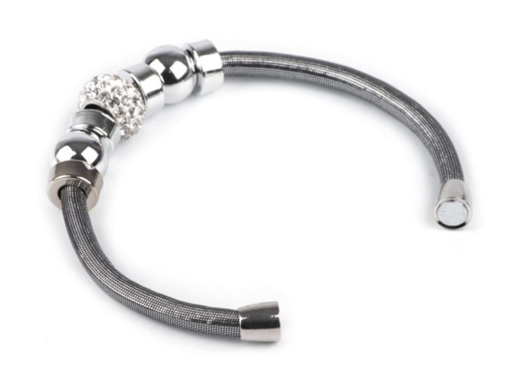 Náramek s originálním mladistvým designem. Na polyesterové šňůře s metalickým efektem jsou navlečené kovové korálky. Prostřední je s drobnými broušenými kamínky, které se oslnivě třpytí. Všechny korálky mají širší průvlek, samy se na šňůře pohybují. Náramek se zapíná pomocí pevného magnetického zapínání. Jeho nošení je velice pohodlné. Štrasový korálek má průměr 1,5 cm, nejmenší kovový má průměr 1,2 cm. Tloušťka efektové šňůry je 0,5 cm.