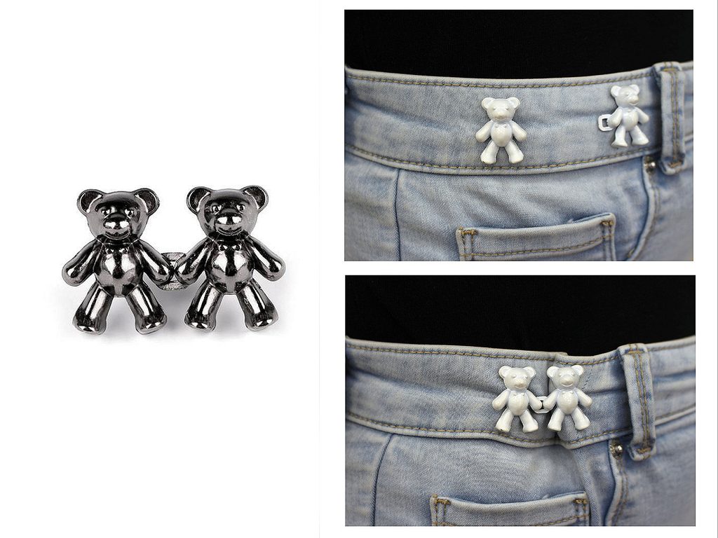 Ozdobné kovové zapínání s medvídky se skládá ze dvou částí, které do sebe zaháknete. Dá se opakovaně používat bez nutnosti přišití, protože má praktické jednobodové připnutí jako odznak. Poslouží tak i jako designový zkracovač v pase kalhot nebo sukní.