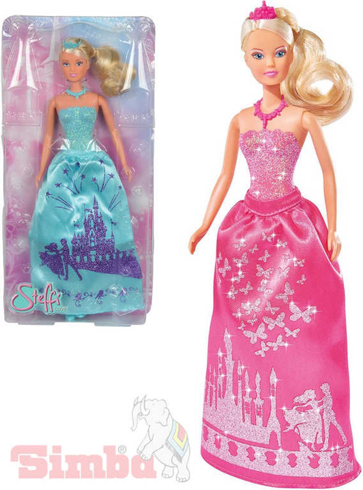 Panenka Steffi jako princezna v dlouhých šatech s úžasným třpytivým motivem, s náhrdelníkem a korunkou ve vlasech. 2 barevná provedení šatů: modré nebo růžové.