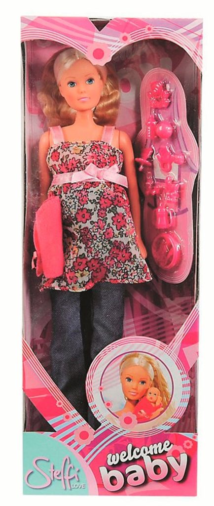 Panenka Steffi - těhotná, s miminkem v bříšku. Bříško panenky lze otevřít a vyndat malé miminko. Součástí 13 ks příslušenství pro miminko. Velikost panenky 29 cm a miminka 5 cm.