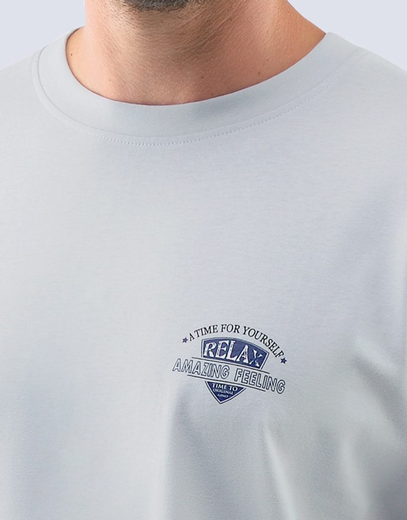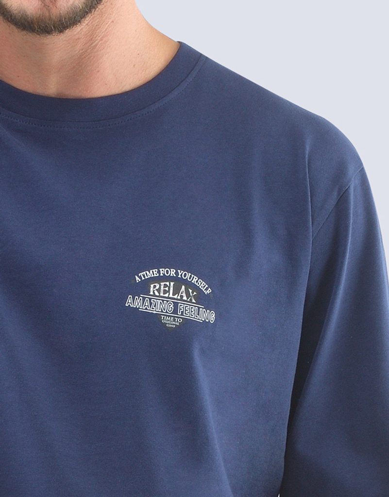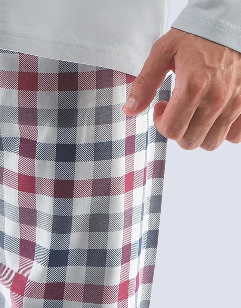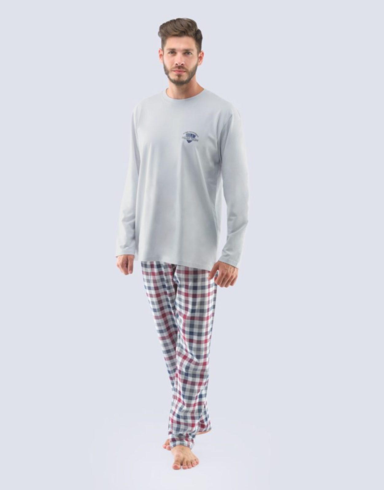 Triko s dlouhým rukávem a dlouhé volné kalhoty, pánské pyžamo. Kalhoty jsou potištěné. Triko je jednobarevné s malým solitérem. Materiál je vyroben ze 100% bavlny. Úplet je vhodný pro všechny, kteří hledají přírodní materiály.