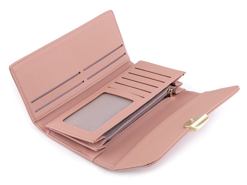 Zavírá se na klopu a ozdobný patent. Má 9 přihrádek na karty, z nich je jedna průhledná. Velkou plochou kapsu a 2 kapsy na bankovky. Mincovník se zapíná na zip.