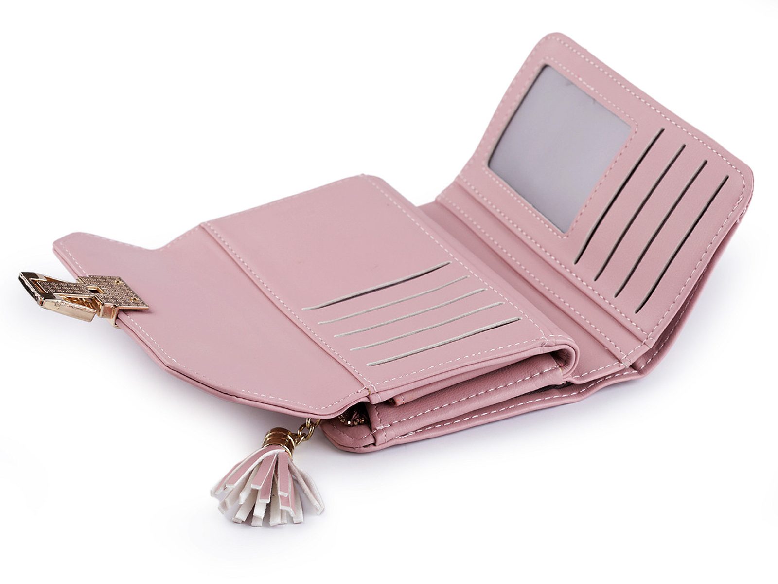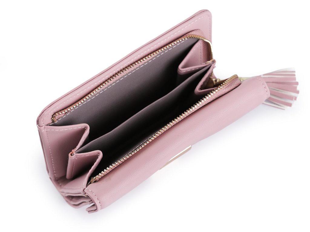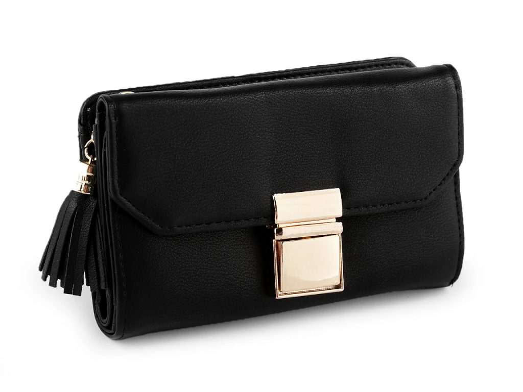 Dámská peněženka s kovovou sponou je velice elegantní. Zip v zadní části má ozdobený střapcem.