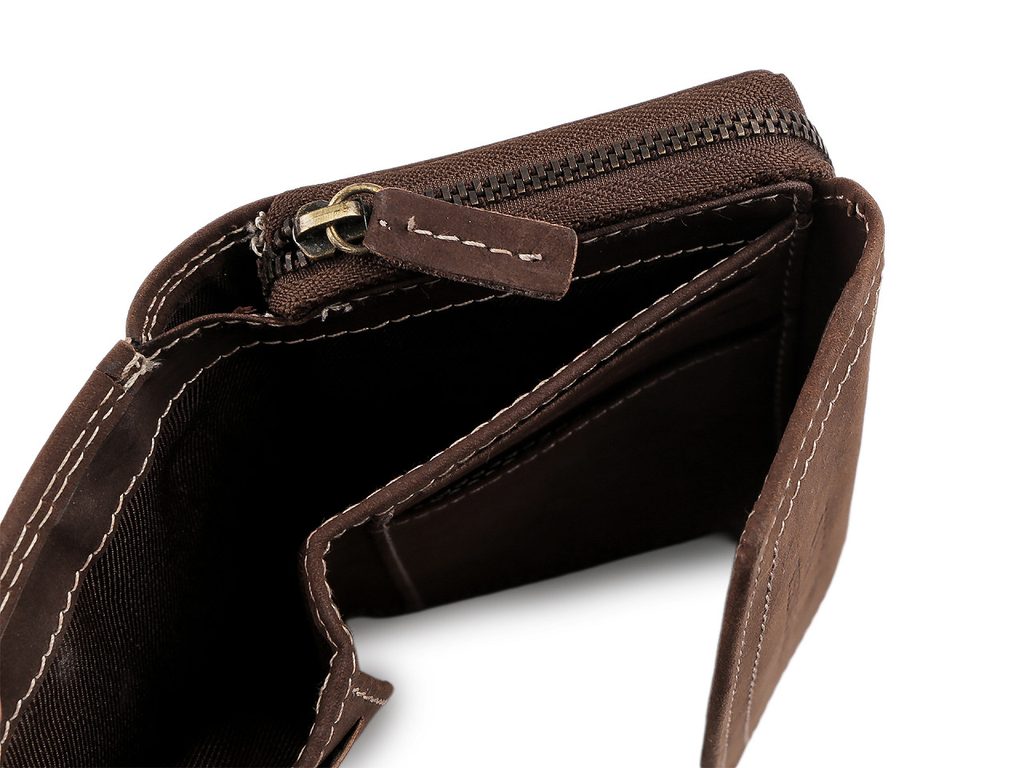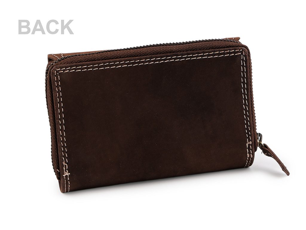 Kožená peněženka má velice kvalitní provedení a chytrý design, je lehká a příjemná na dotek. Má ozdobné proštěpování kontrastní nití.