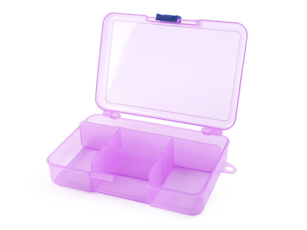 Má 4 menší přihrádky a 1 podlouhlou. Přihrádky jsou pevné, nedají se přestavovat. Krabička je uzavíratelná, se závěsem.