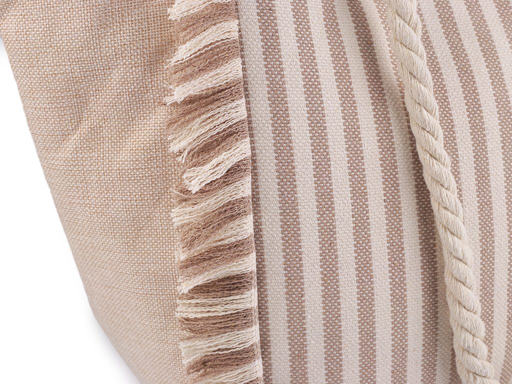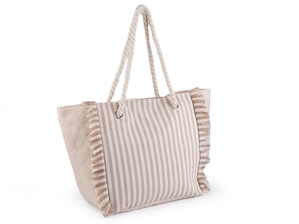 Pruhovanou tašku s třásněmi využijete na procházky městem, u vody i na dovolené. Díky rozšířenému dnu dobře stojí. Je pevná a prostorná, vejde se do ní vše, co potřebujete. Díky velkým uchům z kroucené šňůry ji můžete nést v ruce i na rameni. Uvnitř má taška polyesterovou podšívku s kapsou na drobnosti. Nahoře se taška uzavírá na zip.
