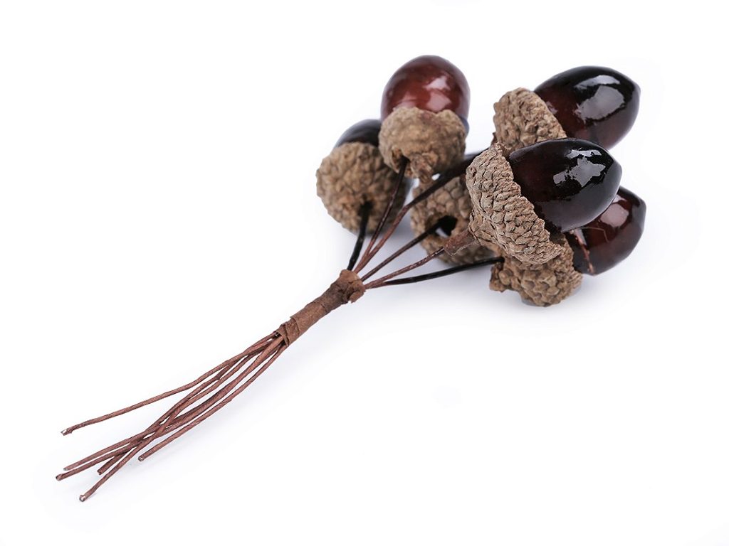 Dekorační žalud je vyrobený z polystyrenu, kalíšek je přírodní. Ve stonku je drát, takže ho můžete libovolně tvarovat. Plody žaludu vyniknou v podzimních vazbách, věncích apod.