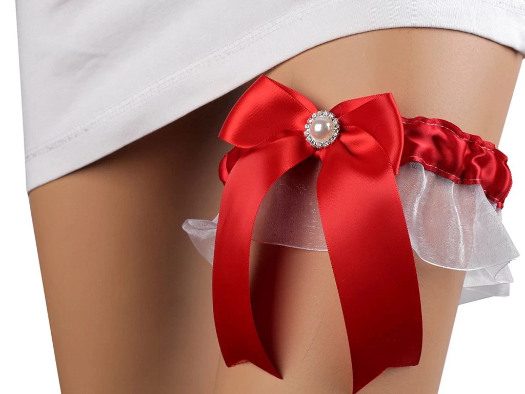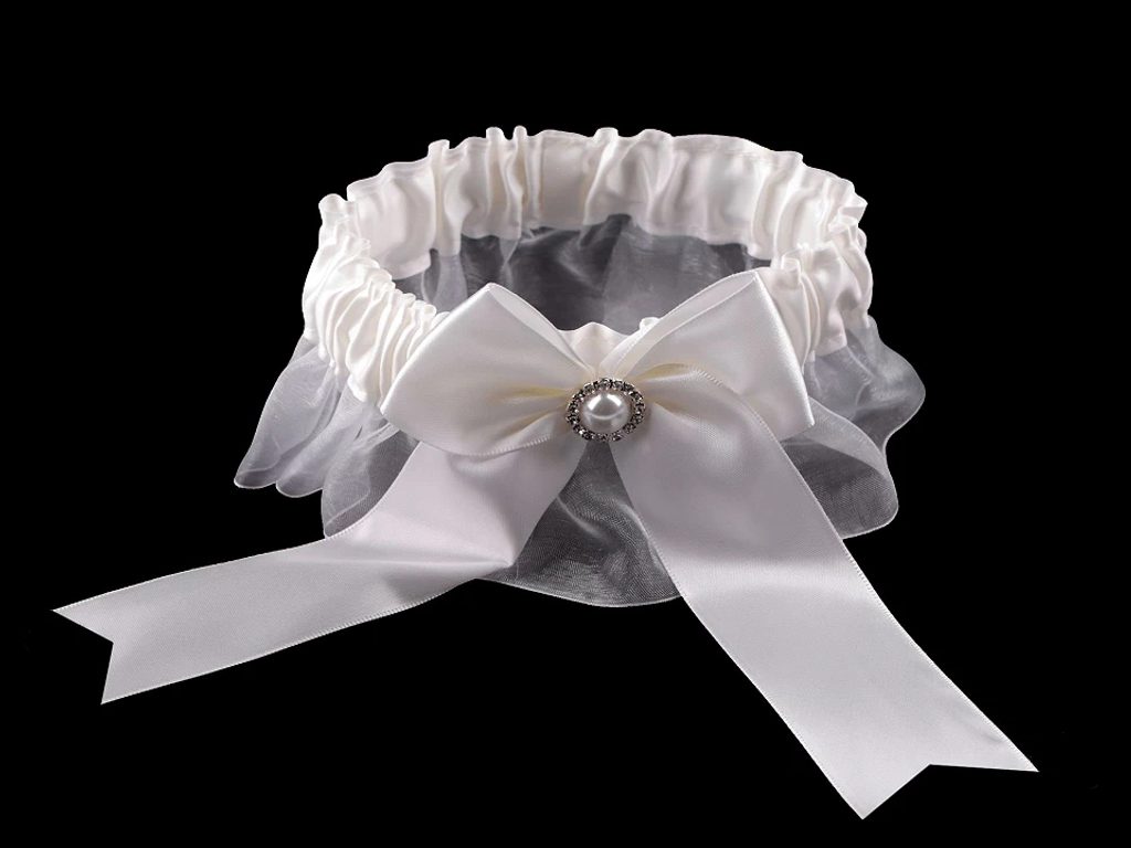 Svatební podvazek s velkou mašlí dobře pruží, příjemně se nosí. Mašle je ozdobená perlou s broušenými kamínky. Podvazek je zabalený v průhledné dárkové krabičce.