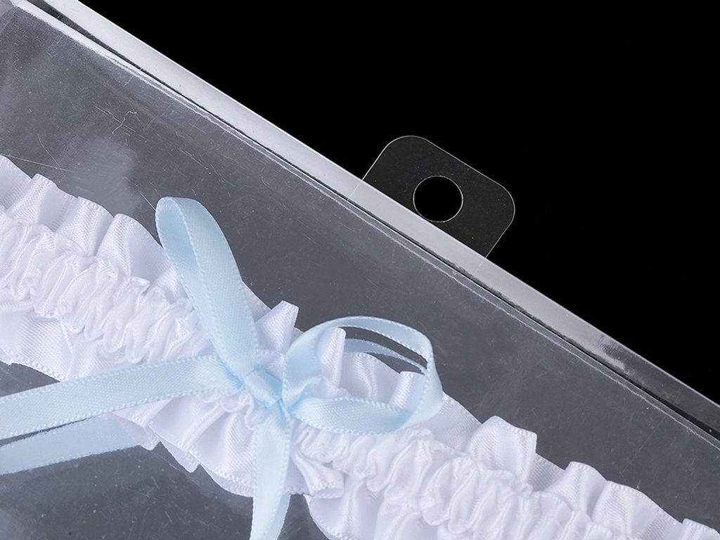 Saténový svatební podvazek zdobí mašlička. Podvazek dobře pruží a příjemně se nosí. Je zabalený v průhledné dárkové krabičce se závěsem.