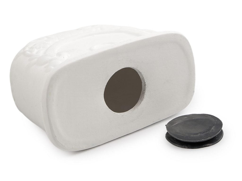 Dole je v pokladničce kulatý otvor, který se uzavírá pomocí plastové zátky. Pokladnička se dá kdykoliv otevřít. Průměr otvoru je 3 cm.