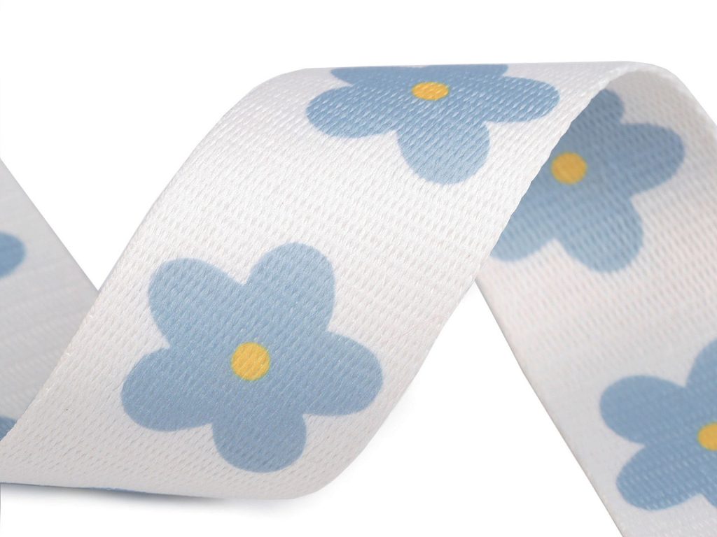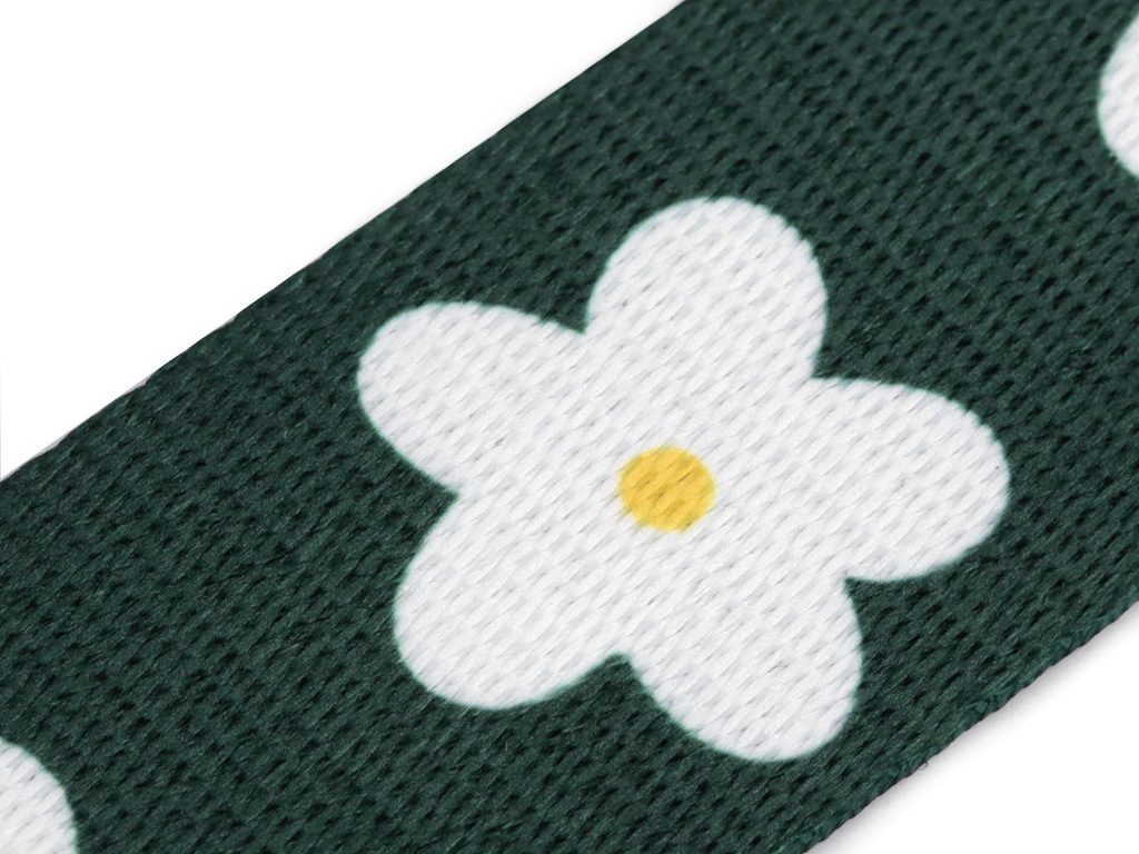 Pevný hladký popruh zdobí oboustranný motiv květů. Vyžijete ho na výrobu tašek, kabelek, batohů, lemování textilních výrobků, jako výplet čalouněného nábytku apod.