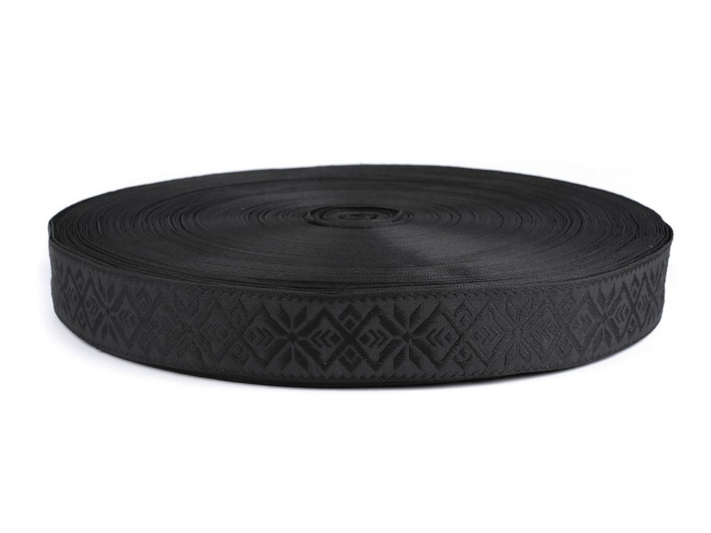 Popruh zdobí jemná strojová výšivka, která je jednostranná. Vynikne na taškách, kabelkách a batozích. Dále je vhodný i na výplety čalouněného nábytku, saní apod.