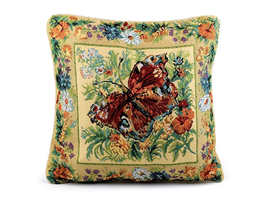 Povlak na polštář s motivem motýla zútulní váš interiér. Zpracováním napodobuje gobelín, dokola je olemovaný lesklou kroucenou šňůrou. Povlak je oboustranný, má pohodlné zapínání na zip.
