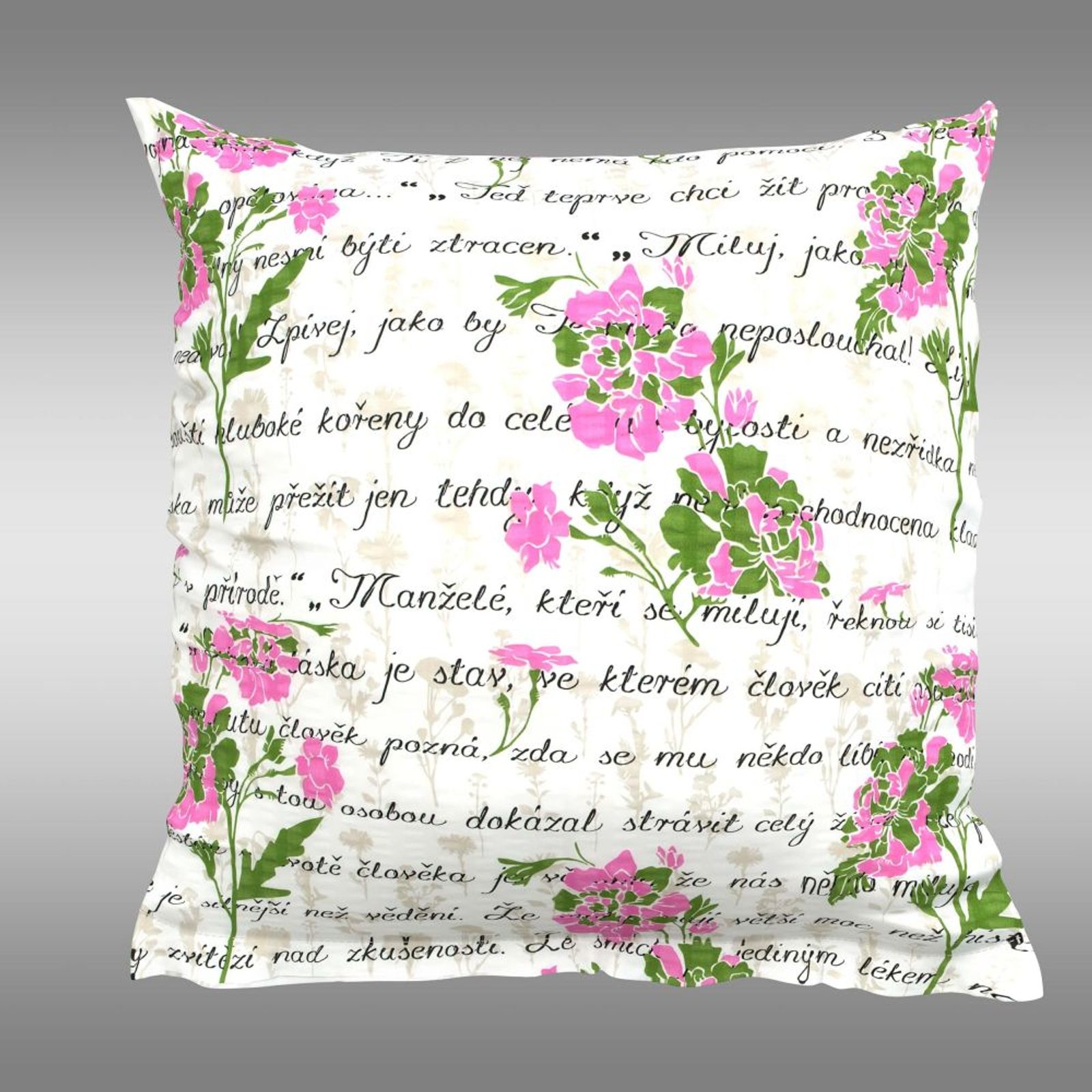 Samostatný povlak na polštář je vyroben ze stejně kvalitní bavlněné tkaniny v krepové úpravě a ve stejném vzoru jako ložní povlečení z naší široké nabídky. Dekorační povlak na polštář PSANÍČKO růžové zdobí romanticky psané citáty a růžové květy na smetanovém podkladu. Povlakem skvěle doplníte romantické krepové povlečení PSANÍČKO růžové.