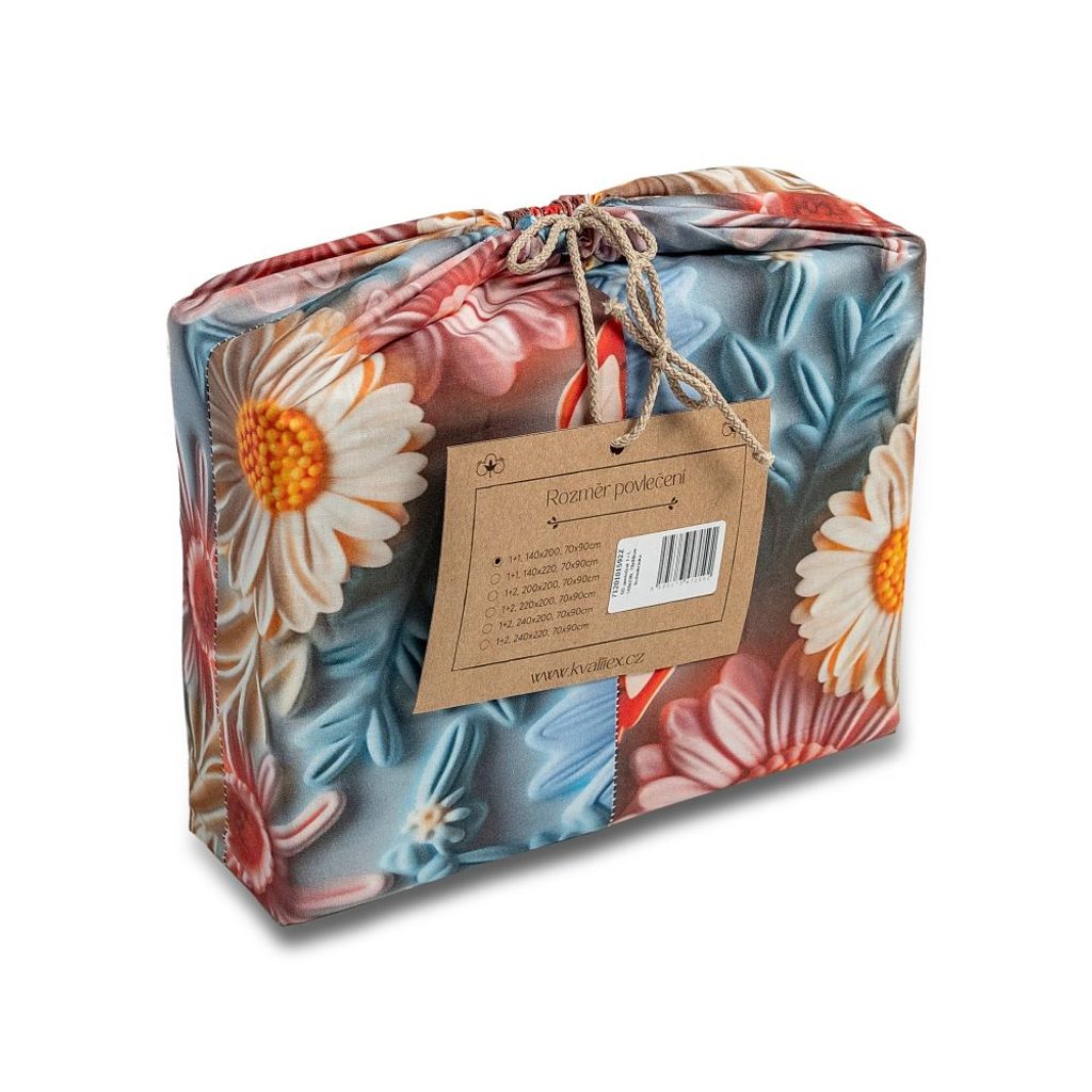 5D tisk na povlečení představuje moderní technologii digitálního potisku, která vytváří realistické a trojrozměrné vzory s výraznou hloubkou a detaily. Díky této metodě získávají motivy živé, syté barvy, které si dlouhodobě uchovávají intenzitu i po opakovaném praní. Povlečení s 5D tiskem kombinuje estetiku a pohodlí – je vyrobeno z jemné, prodyšné bavlny, příjemné na dotek a vhodné pro celoroční použití. Tato kombinace kvalitního materiálu a moderního designu proměňuje ložnici v elegantní a stylové prostředí, kde se spojuje vizuální efekt s komfortem spánku. Plošná hmotnost (gramáž) tkaniny je 130-135g/m2.