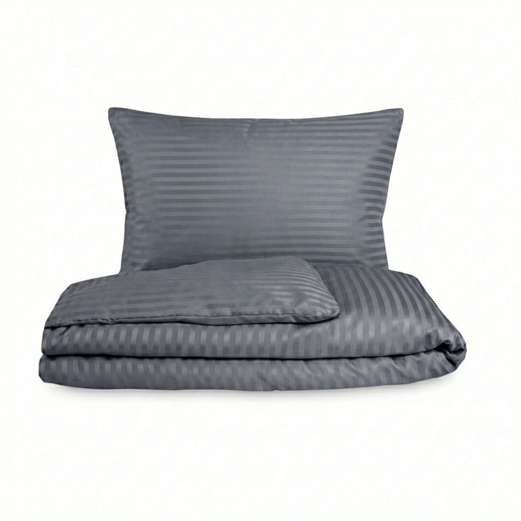 Kolekce saténového povlečení je charakteristická vodorovnými proužky, které jsou vytvořeny vlastním tkaním. Povlečení z bavlněného saténu vyniká decentním leskem a působí velmi luxusně. Použitá tkanina je velmi kvalitní a zároveň jemná. Saténové povlečení s proužkem v tmavě šedé barvě je momentálně velmi trendy a zároveň působí velmi elegantně.