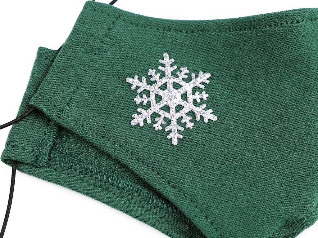 Bavlněná rouška ozdobená třpytivou sněhovou vločkou bude stylovým zimním doplňkem. Je jednovrstvá, pružná teplákovina, ze které je vyrobená, má hustou venkovně a vnitřně pletenou strukturu, která zachytává kapénky. Lze ji prát na 30°C s přídavkem dezinfekce na prádlo.