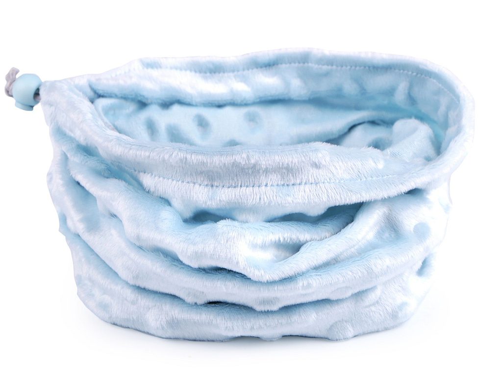 Roztomilý nákrčník z materiálu minky s 3D puntíky. Měkký materiál je velice příjemný na dotek. U krku se dá nákrčník stáhnout pruženkou s brzdičkou. Nebo můžete brzdičkou pruženku úplně stáhnout a vytvořit tak dítěti čepici se svěšeným koncem.
